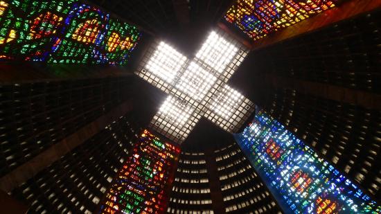 O interior da Catedral é deslumbrante e, durante o dia, percebe-se a luz solar entrando nos 4 braços de luz, dando cores diversas à Igreja dependendo da posição do Sol. Ao nascer, a Igreja ganha tons esverdeados, tornando-se amarela ao chegar do meio-dia, azul durante a tarde e vermelha ao anoitecer. Esses 4 braços de luz têm 60 metros de altura e representam os quatros pontos cardeias, culminando no topo com a Cruz Grega, de 4 lados iguais, representando a igualdade entre os homens de todas as raças e credos.